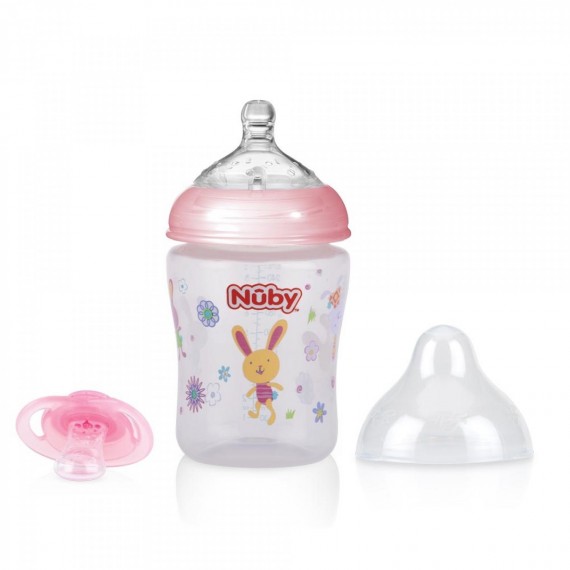 Cette jolie bouteille et 1 sucette ne sont-elles pas assorties? L'ensemble comprend un biberon avec tétine en silicone à débit lent et 1 sucette orthodontique. La capacité de la bouteille est de 270 ml. La sucette convient aux bébés âgés de 0 à 6 mois.