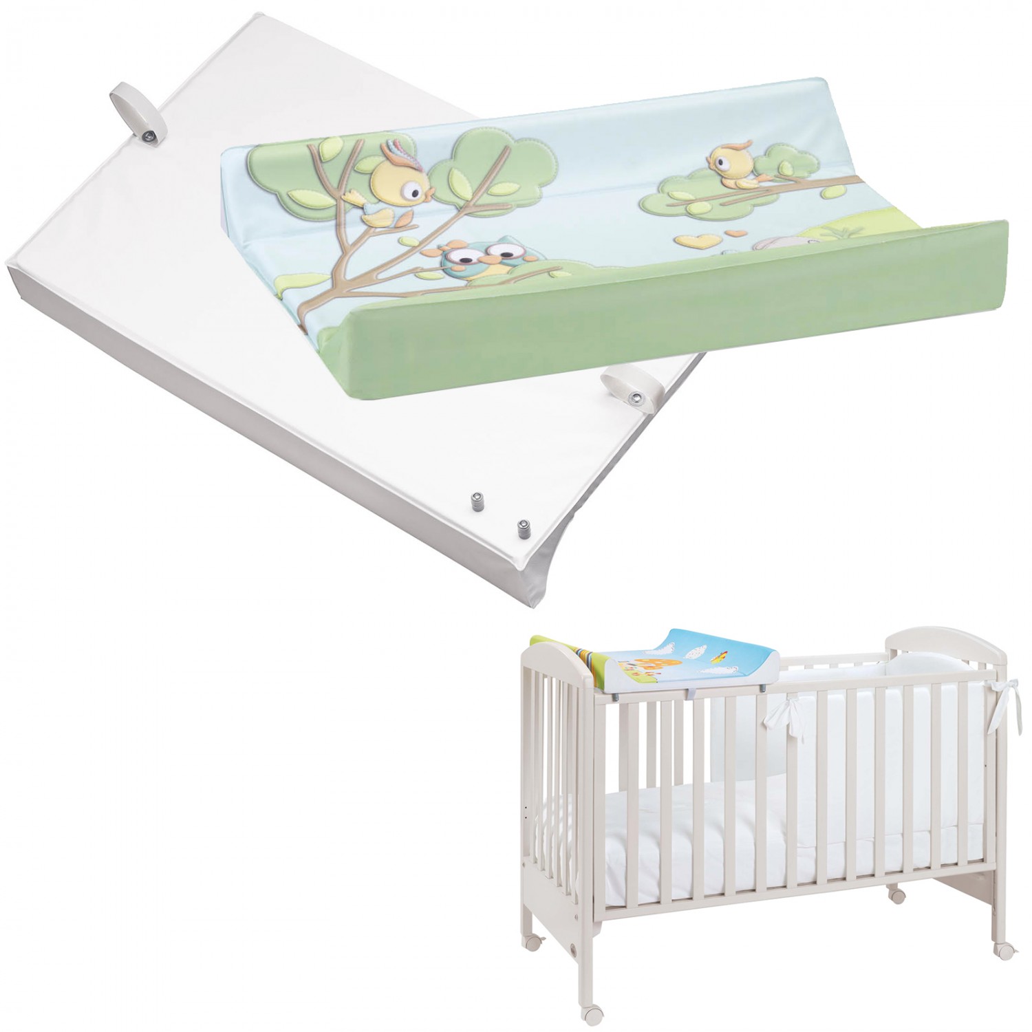 Matelas à langer molletonné avec fond rigide et système de fixation aux lits d’enfant.