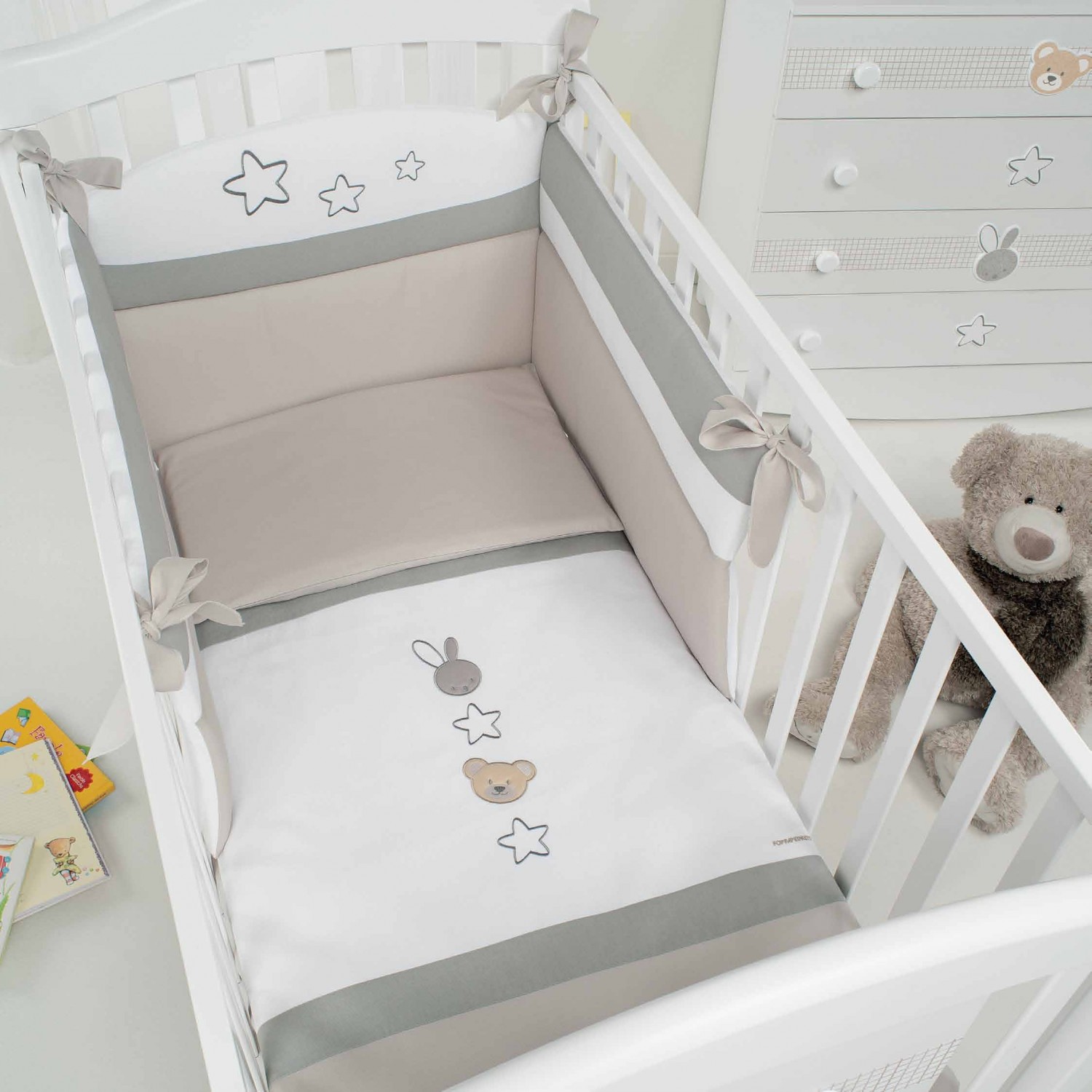 Ensemble de couette composé de: pare-chocs, sac amovible, rembourrage et taie d'oreiller.