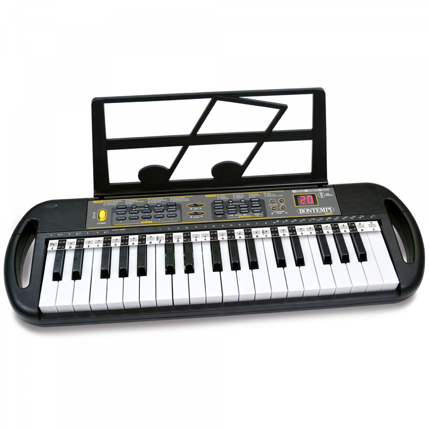 Clavier de bureau électronique 37 touches • 3 sons • 8 rythmes • 24 morceaux préenregistrés • Effet Sustain • Commandes : Master volume, Stop, Tempo +/– • Prise pour adaptateur secteur (non incluse) • Prise pour microphone à condensateur (non incluse) ) • Alimentation : 4 piles 1,5 V (non fournies)