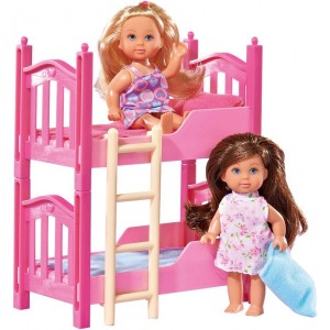 Evi e sua sorella gemella sono pronte per la nanna nel loro letto a castello, indossano una camicia da notte e portano con loro anche il cuscino.