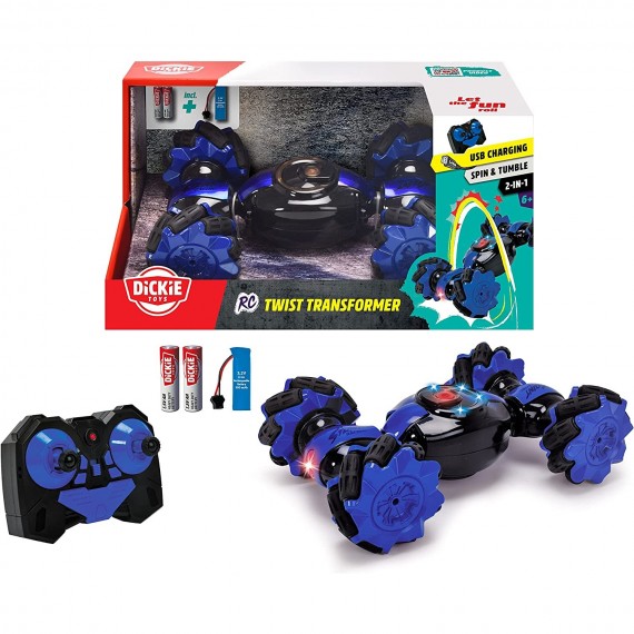 Radiocommande Twist Transformer, 2 canaux, fréquence 2,4 GHz, transformable de Racing Car en Offroad ! Avec éclairage intégré et fonction flip. Vitesse jusqu'à 10 km/h. Fonctionne avec 1 pile 3,2 V-500 MAH-LI - FERRIT incluse (RX) et 2 piles 1,5V-R6 incluses (TX). Convient aux enfants à partir de 6 ans.