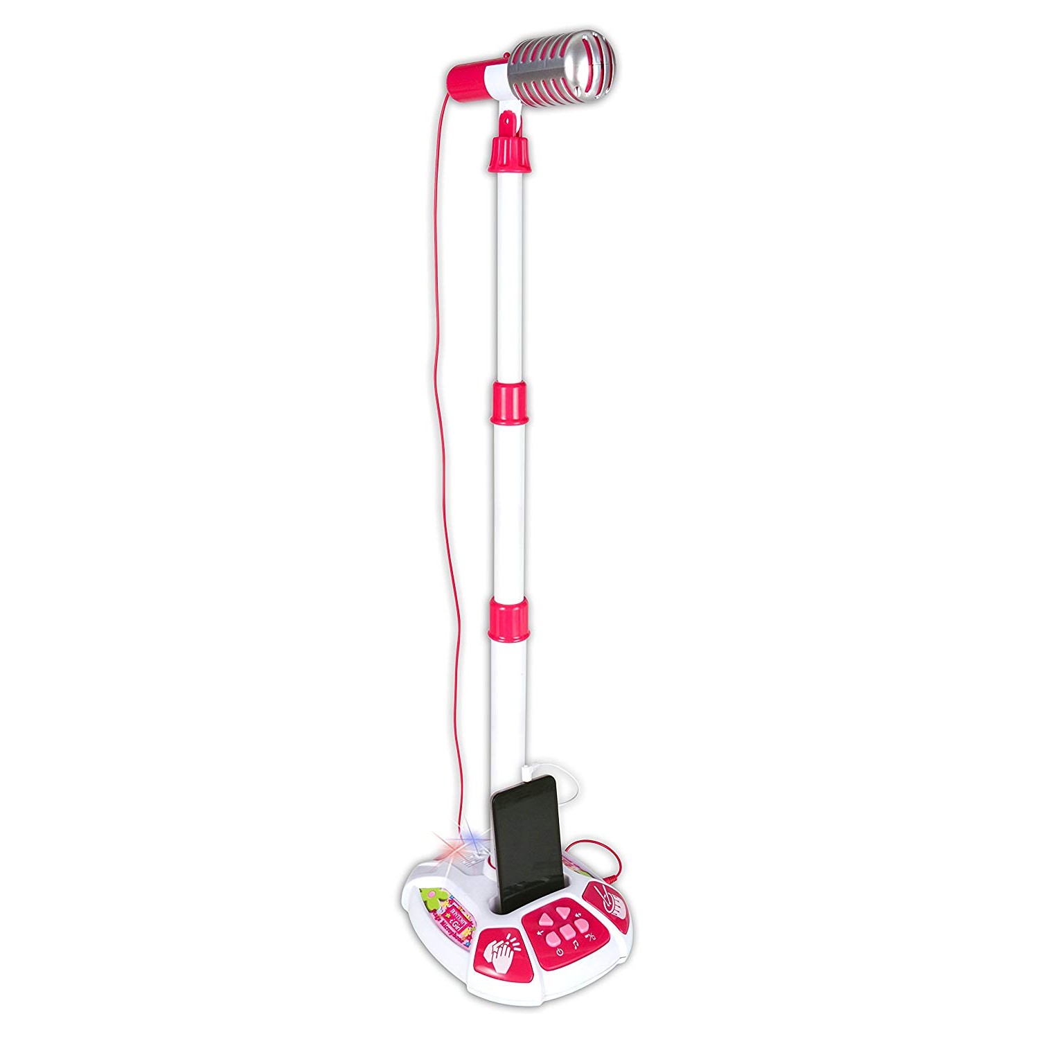 Micro de scène ou de table avec pied réglable en hauteur : hauteur maxi 103 cm. 12 démos, 5 effets sonores, 5 rythmes de batterie, effets lumineux. Arrêt automatique. Connexion à un lecteur MP3 (Smartphone, iPod, CD player...), câble inclus. Alimentation par 3 piles R6/AA non fournies. A partir de 3 ans.