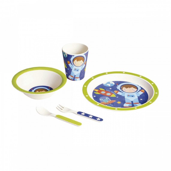 L'ensemble est fabriqué avec des matériaux totalement écologiques et biodégradables tels que le bambou et le maïs. Il est conçu avec des bords arrondis, pour faciliter l'apprentissage des plus petits à utiliser la vaisselle.