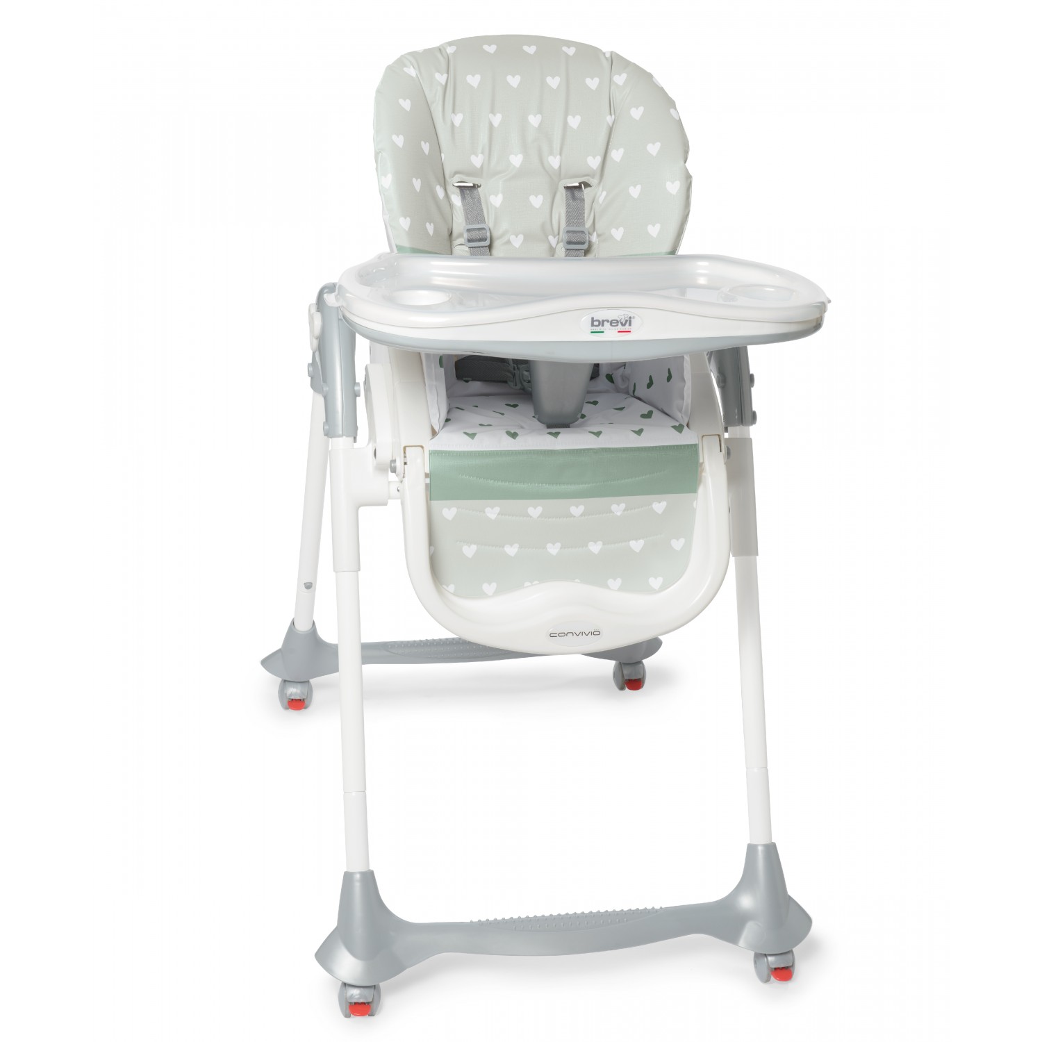 Il Seggiolone Pappa Brevi Convivio completamente rinnovato con un fondamentale ed esclusivo sistema di declinazione totale in modo da permettere al bambino un comodo riposino dopo il desiderato e atteso momento della pappa. Il seggiolone Convivio è multifunzionale dotato di 2 ruote posteriori per facilitare gli spossamenti.