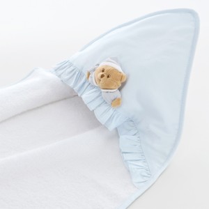 Confortable et indispensable à l'heure du bain quotidien, il est utile pour envelopper complètement le bébé après le bain, en l'entourant d'une éponge douce 100% coton blanc. La capuche est recouverte de tissu à pois doux, avec l'application de l'ours Puccio très tendre, qui donne au produit une aura de tendresse.
